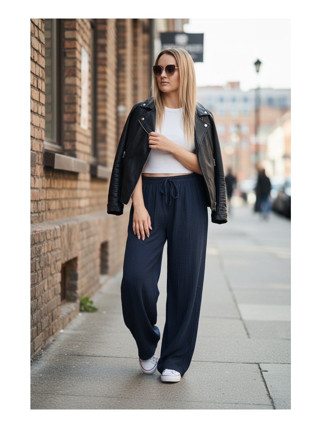 Objevte jedinečné kalhoty vyrobené z jemného, prodyšného mušelínu, které poskytují nevídaný komfort nošení i v nejteplejších dnech. Jejich široká nohavice dodává celému outfitu módní, moderní charakter, opticky prodlužuje postavu a přidává lehkost celkovému stylu. Ideální pro každodenní nošení, do práce i na výjimečné příležitosti – tyto kalhoty se skvěle kombinují s různými topy, od minimalistických triček, přes elegantní halenky až po svetry. Vsaďte na klasický, ale zároveň sofistikovaný design, který vám umožní užívat si pohodlí i originální styl. Velikost je univerzální a odpovídá ženám nosícím velikosti S, M nebo L.