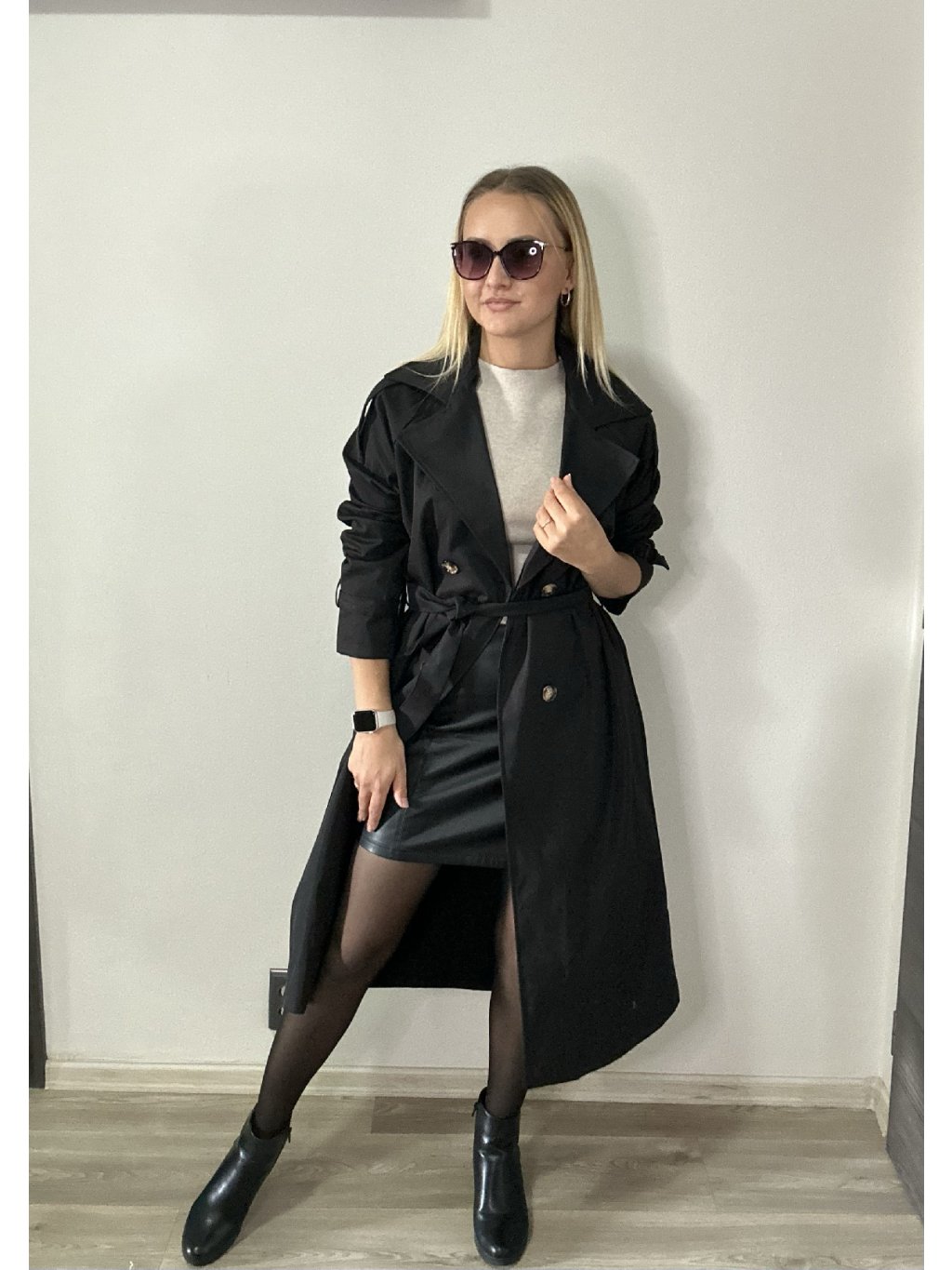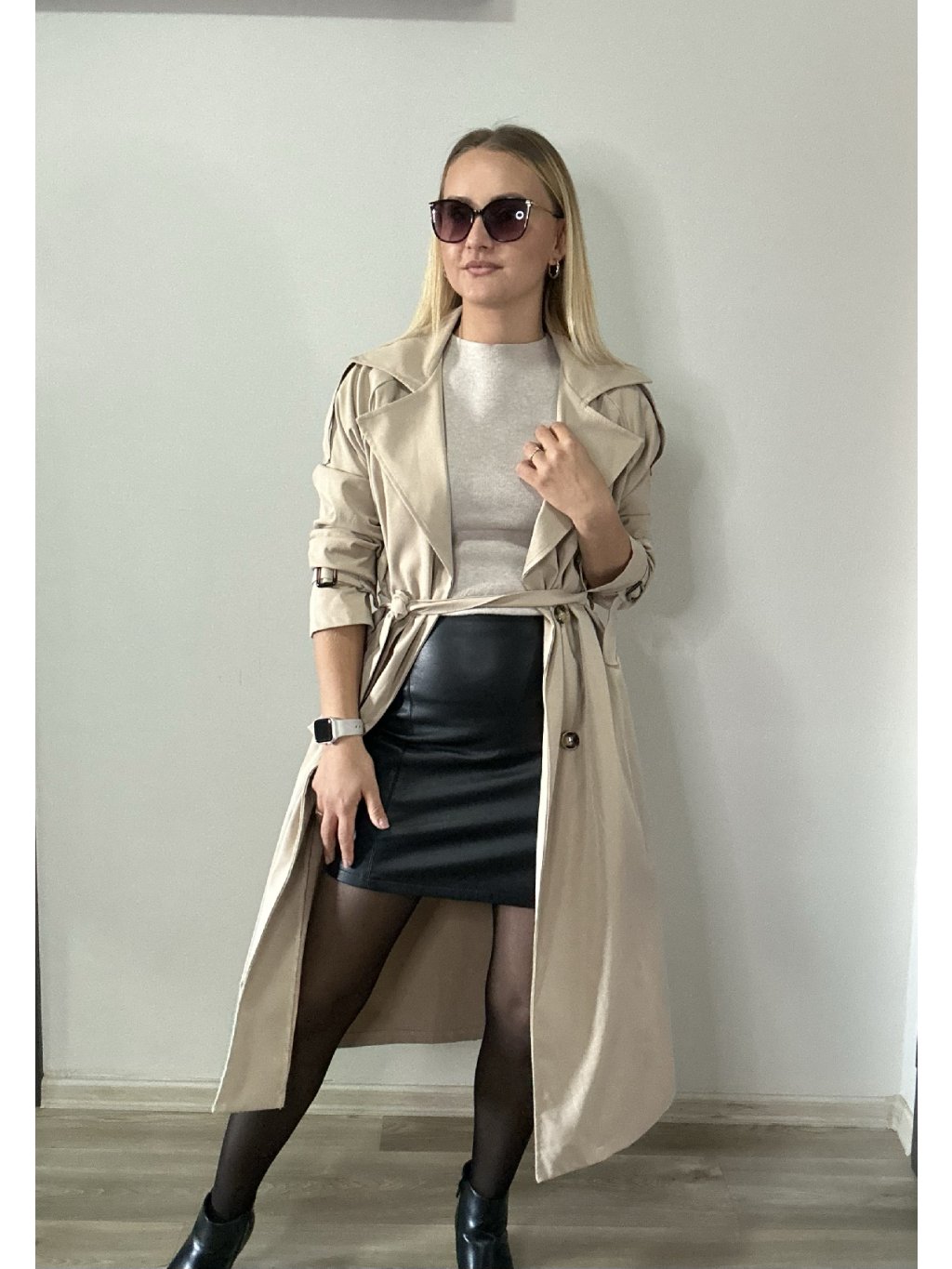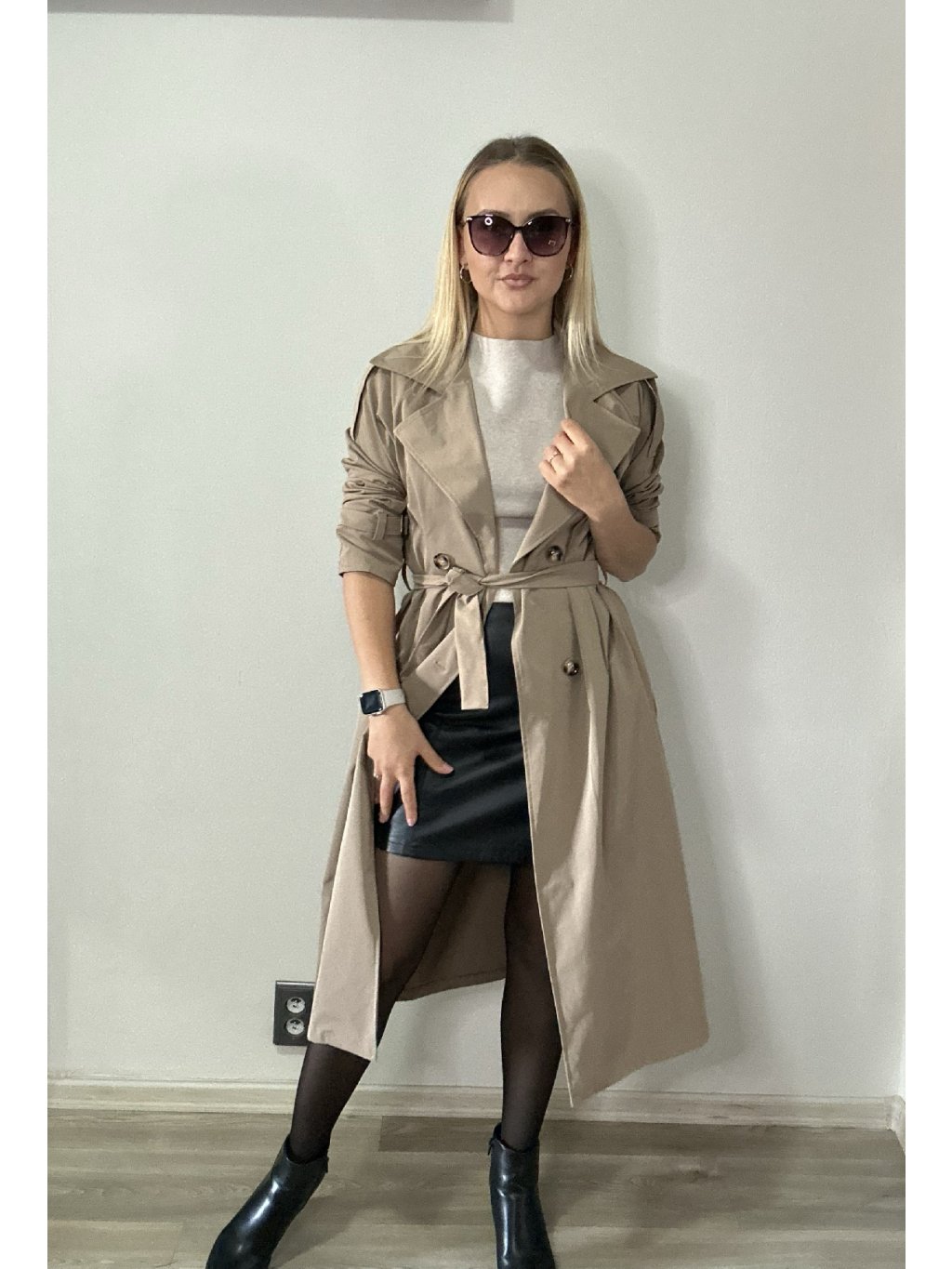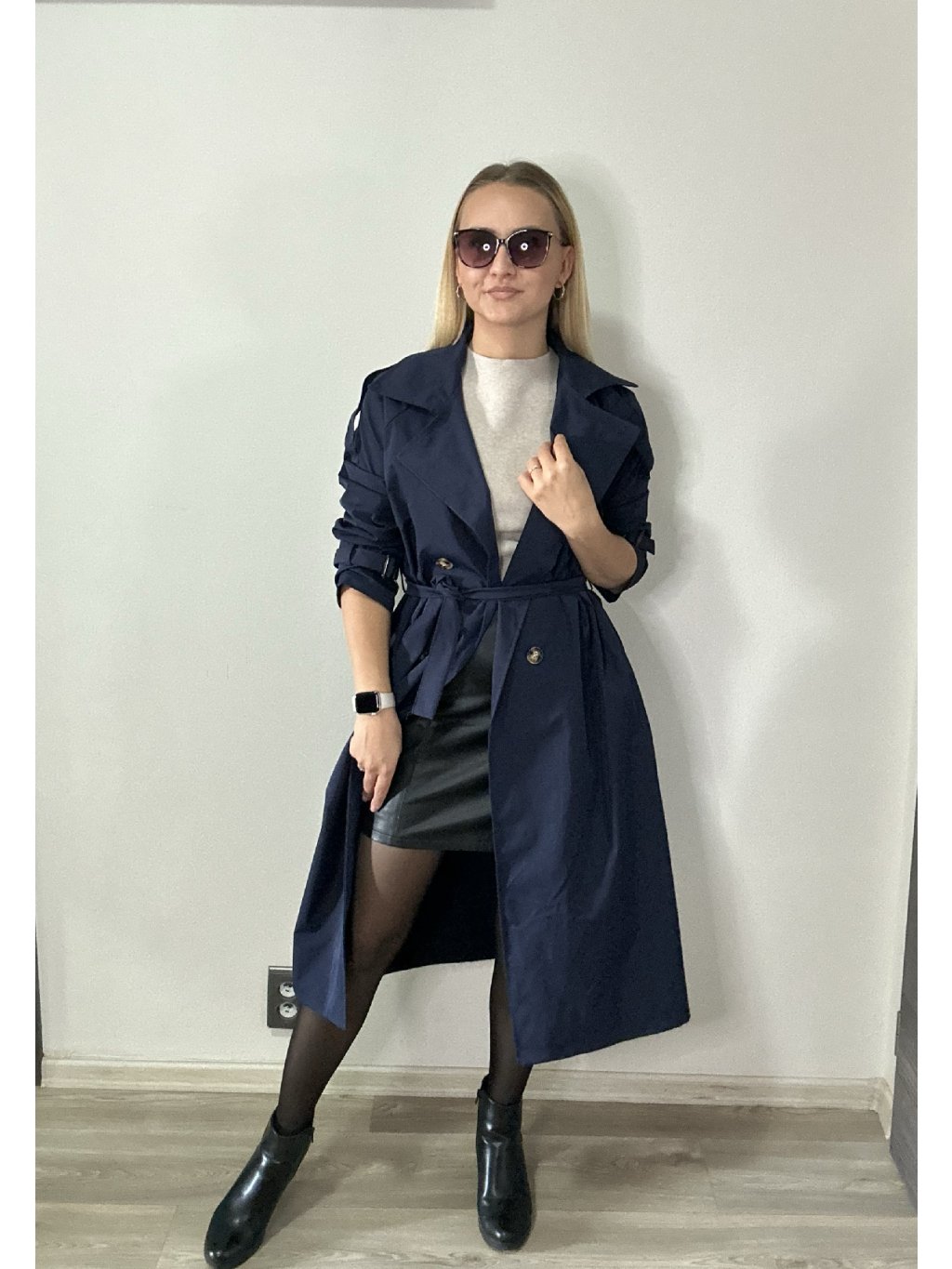 Stylový dámský kabát klasického střihu je nezbytným prvkem každého dámského šatníku. Model s efektním, širokým límcem, vázaným páskem v pase a dvojitým řadou knoflíků odkazuje na nadčasový styl trenčkotů. Délka nad kolena a zúžení v pase krásně podtrhují siluetu, přidávající celku eleganci. Rukávy s ozdobným manžetou a jemným nařasením na ramenou dodávají lehkost a ženský charakter.